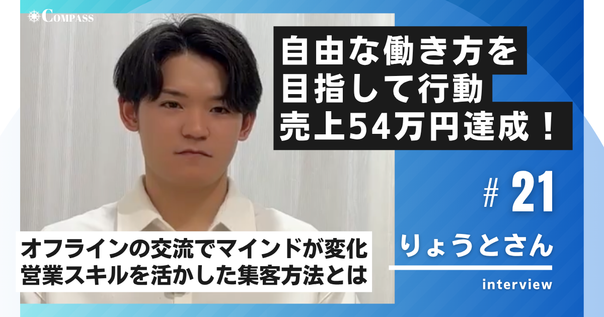 「自由な働き方を手に入れたい」という思いでCOMPASSに入会し、5か月で54万円の売上を達成させます。